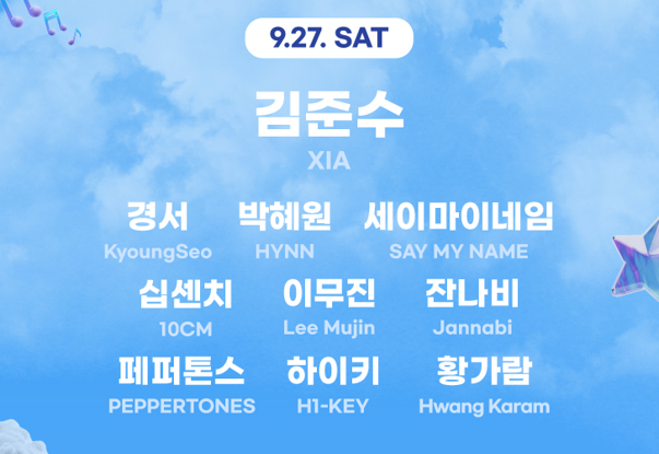 - September 27 (Sat): Kyungseo, Say My Name, 10cm, Lee Mujin, Jannabi, Peppertones, H1-KEY, Hwang Garam